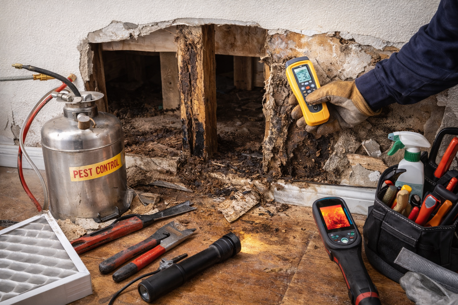 We coordinate licensed pest control partners for treatment and verify the structural repair scope.